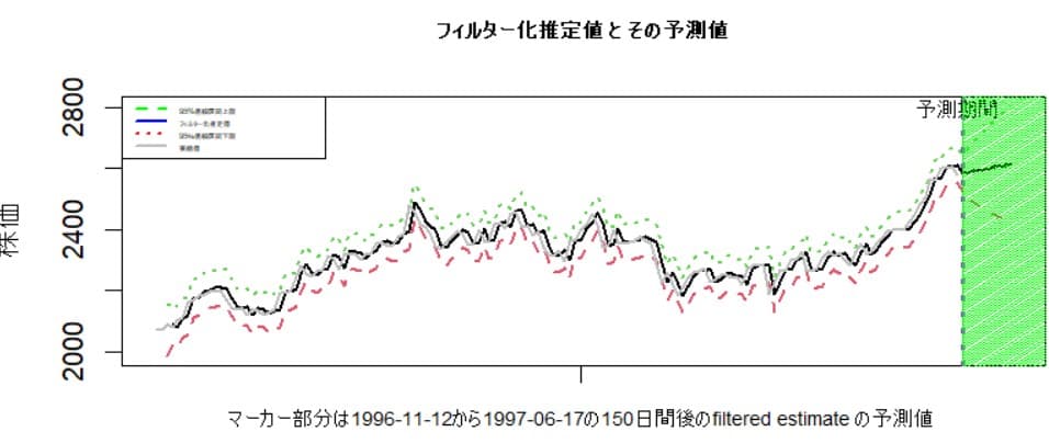 カルマンフィルターのアルゴリズムで常に1期先の予測値が計算される。predict関数を使うと任意の期間の予測値が計算できる。1996-11-12から1997-06-17の150日間 の実際値があるので、6/18日以降の10日分のフィルター化推定値の予測値を計算してみると下図のようになる