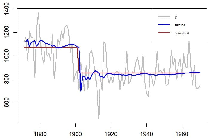 0.004686483 と小ことがわかる。このモデルをカルマンフィルターによってフィルター化推定値(filtered estimate)と平滑化推定値(smoothed estimate)を計算してみる。